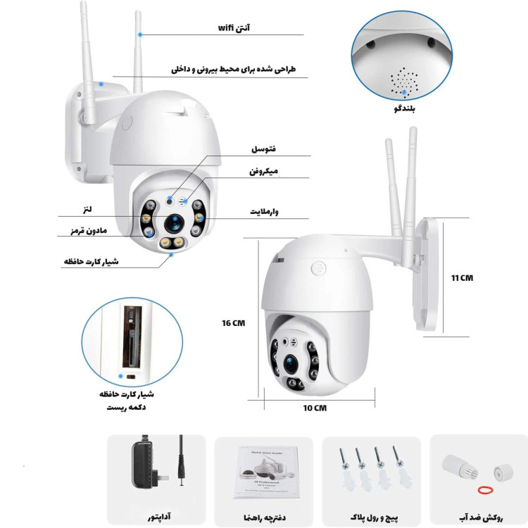 ویژگی ها: کیفیت تصویر 2 مگاپیکسل FULL HD دارای دید درشب رنگی WARM LIGHT و IR بدون نیاز به کابلکشی و دستگاه DVR قابلیت چرخش 360 درجه افقی 120 درجه عمودی قابلیت ضبط صدا و تصویر بر روی حافظه جانبی دوربین امکان مکالمه 2 طرفه (مجهز به میکروفن و بلندگو) دارای قابلیت تشخیص حرکت (ارسال هشدار از طریق نرم افزار) قابلیت تعقیب سوژه متحرک پشتیبانی از کارت حافظه MICRO SD جهت ضبط صدا و تصویر نرم افزار کنترل دوربین و انتقال صدا و تصویر آنلاین بر روی موبایل برای ANDROID و IOS دارای WIFI داخلی و امکان اتصال به مودمWIFI بصورت وایرلس و کابلی نصب و راه اندازی سریع و آسان بدون نیاز به دانش فنی اقلام همراه محصول: دفترچه راهنما، پایه جهت نصب روی دیوار مناسب جهت استفاده در محیط های داخلی و بیرونی برای مراقبت از کودک و سالمند نظارت بر خانه، محل کار، پارکینگ، فروشگاه، انبار و ...